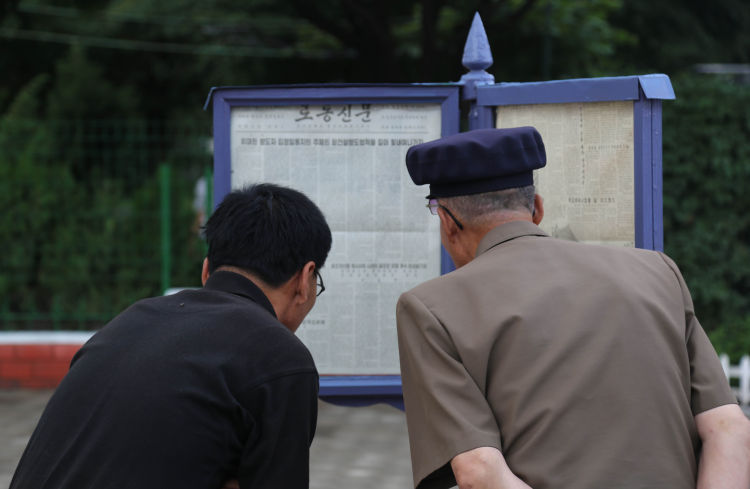 6月19日,在平壤凱旋門(mén)附近的一處報(bào)紙櫥窗前,市民閱讀習(xí)近平總書(shū)記在朝鮮主流媒體《勞動(dòng)新聞》發(fā)表的署名文章。新華社記者江亞平攝
