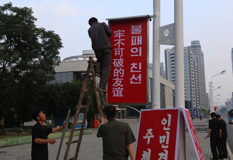 6月19日,工作人員在平壤街頭懸掛使用中朝雙語(yǔ)書(shū)寫(xiě)的“牢不可破的友誼”標(biāo)語(yǔ)牌。新華社記者江亞平攝