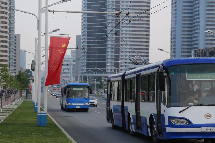 6月19日,平壤市區(qū)主要大街倉(cāng)田大街兩旁已經(jīng)懸掛著朝中兩國(guó)國(guó)旗。新華社記者江亞平攝