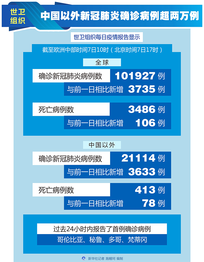 世衛(wèi)組織每日疫情報告顯示,截至歐洲中部時間7日10時(北京時間7日17時),中國以外新冠肺炎確診病例較前一日增加3633例,達到21114例;死亡病例較前一日增加78例,達到413例。