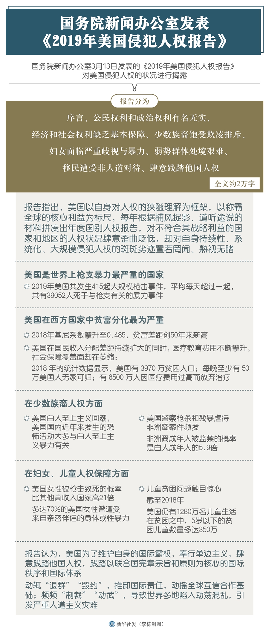 新華社北京3月13日電(記者王子銘、張云龍)國務(wù)院新聞辦公室13日發(fā)表《2019年美國侵犯人權(quán)報告》,對美國侵犯人權(quán)的狀況進行揭露。