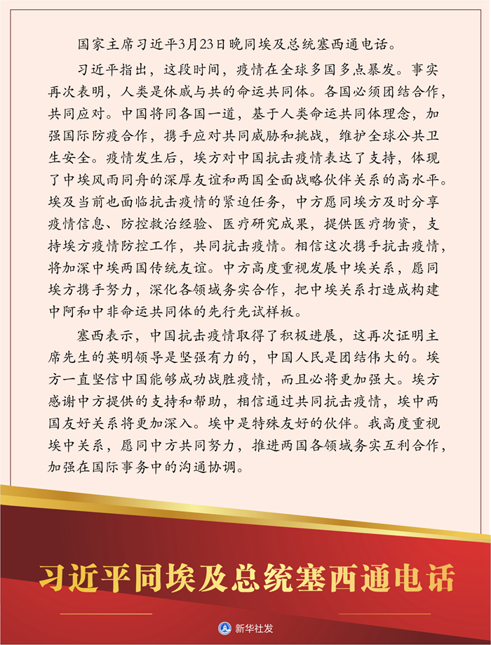 習(xí)近平指出,這段時(shí)間,疫情在全球多國(guó)多點(diǎn)暴發(fā)。事實(shí)再次表明,人類(lèi)是休戚與共的命運(yùn)共同體。各國(guó)必須團(tuán)結(jié)合作,共同應(yīng)對(duì)。中國(guó)將同各國(guó)一道,基于人類(lèi)命運(yùn)共同體理念,加強(qiáng)國(guó)際防疫合作,攜手應(yīng)對(duì)共同威脅和挑戰(zhàn),維護(hù)全球公共衛(wèi)生安全。疫情發(fā)生后,埃方對(duì)中國(guó)抗擊疫情表達(dá)了支持,體現(xiàn)了中埃風(fēng)雨同舟的深厚友誼和兩國(guó)全面戰(zhàn)略伙伴關(guān)系的高水平。埃及當(dāng)前也面臨抗擊疫情的緊迫任務(wù),中方愿同埃方及時(shí)分享疫情信息、防控救治經(jīng)驗(yàn)、醫(yī)療研究成果,提供醫(yī)療物資,支持埃方疫情防控工作,共同抗擊疫情。相信這次攜手抗擊疫情,將加深中埃兩國(guó)傳統(tǒng)友誼。中方高度重視發(fā)展中埃關(guān)系,愿同埃方攜手努力,深化各領(lǐng)域務(wù)實(shí)合作,把中埃關(guān)系打造成構(gòu)建中阿和中非命運(yùn)共同體的先行先試樣板。