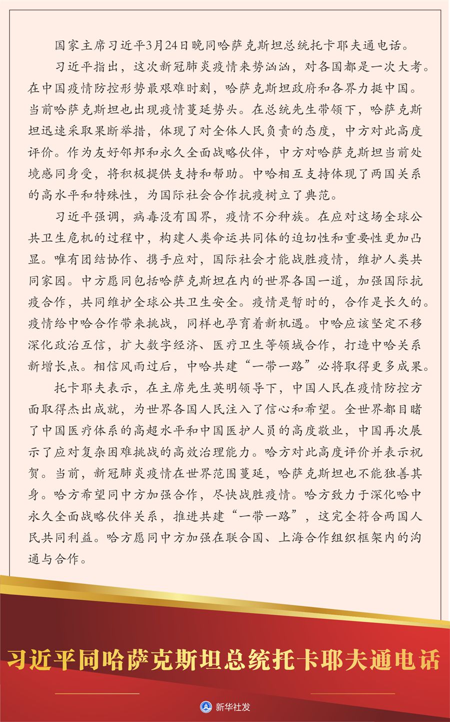 托卡耶夫表示,在主席先生英明領(lǐng)導(dǎo)下,中國人民在疫情防控方面取得杰出成就,為世界各國人民注入了信心和希望。全世界都目睹了中國醫(yī)療體系的高超水平和中國醫(yī)護(hù)人員的高度敬業(yè),中國再次展示了應(yīng)對復(fù)雜困難挑戰(zhàn)的高效治理能力。哈方對此高度評價(jià)并表示祝賀。當(dāng)前,新冠肺炎疫情在世界范圍蔓延,哈薩克斯坦也不能獨(dú)善其身。哈方希望同中方加強(qiáng)合作,盡快戰(zhàn)勝疫情。哈方致力于深化哈中永久全面戰(zhàn)略伙伴關(guān)系,推進(jìn)共建“一帶一路”,這完全符合兩國人民共同利益。哈方愿同中方加強(qiáng)在聯(lián)合國、上海合作組織框架內(nèi)的溝通與合作。
