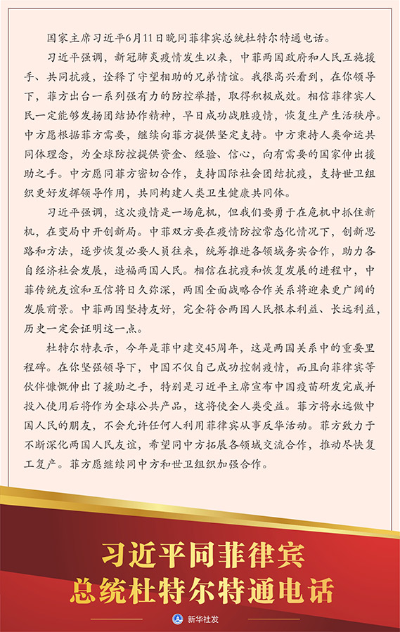 新華社北京6月11日電 國(guó)家主席習(xí)近平6月11日晚同菲律賓總統(tǒng)杜特爾特通電話(huà)。