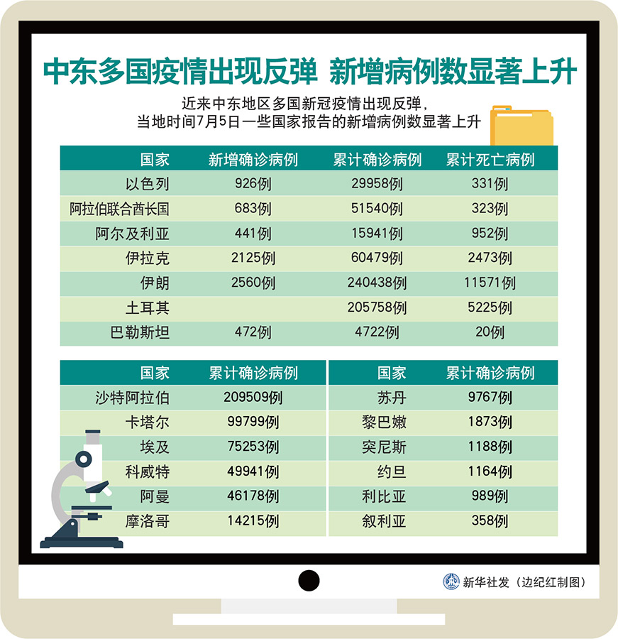 新華社喀土穆7月5日電 綜合新華社駐中東地區(qū)記者報(bào)道:近來(lái)中東地區(qū)多國(guó)新冠疫情出現(xiàn)反彈,一些國(guó)家5日?qǐng)?bào)告的新增病例數(shù)顯著上升,多國(guó)政府敦促民眾嚴(yán)格落實(shí)防控措施。