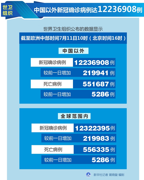 世衛(wèi)組織每日疫情報告顯示,截至歐洲中部時間11日10時(北京時間16時),中國以外新冠確診病例較前一日增加219941例,達到12236908例;中國以外死亡病例較前一日增加5286例,達到551687例。