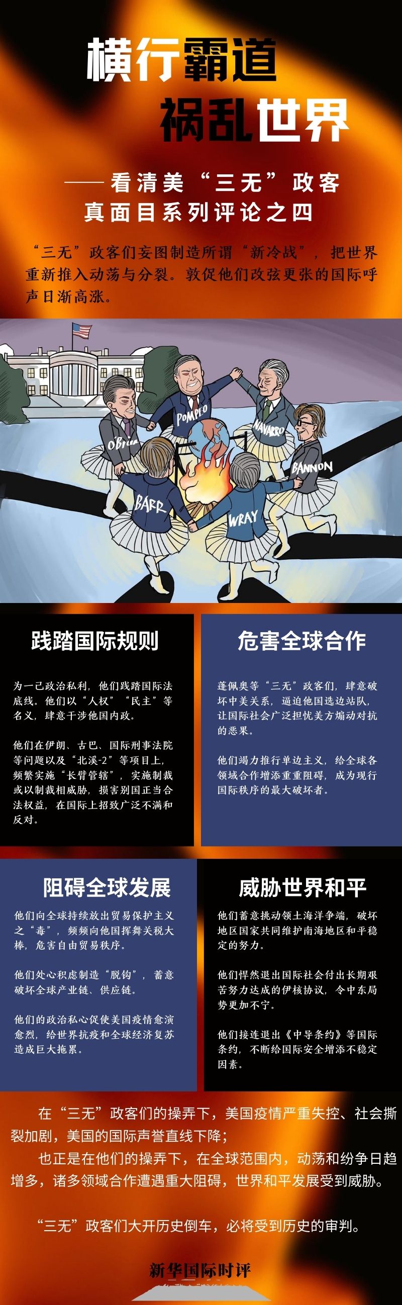 “三無(wú)”政客們的亂言與惡行,正在美國(guó)和國(guó)際上造成種種惡果。正是在他們的操弄下,美國(guó)疫情嚴(yán)重失控、社會(huì)撕裂加劇,美國(guó)的國(guó)際聲譽(yù)直線下降;也正是在他們的操弄下,在全球范圍內(nèi),動(dòng)蕩和紛爭(zhēng)日趨增多,諸多領(lǐng)域合作遭遇重大阻礙,世界和平發(fā)展受到威脅?!叭裏o(wú)”政客們大開(kāi)歷史倒車,必將受到歷史的審判。
