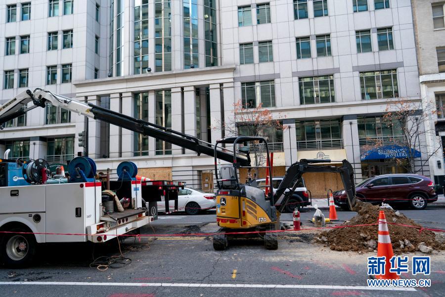 11月19日,在美國(guó)華盛頓,工作人員在裝修一家文具店的門臉。新華社記者 劉杰 攝
