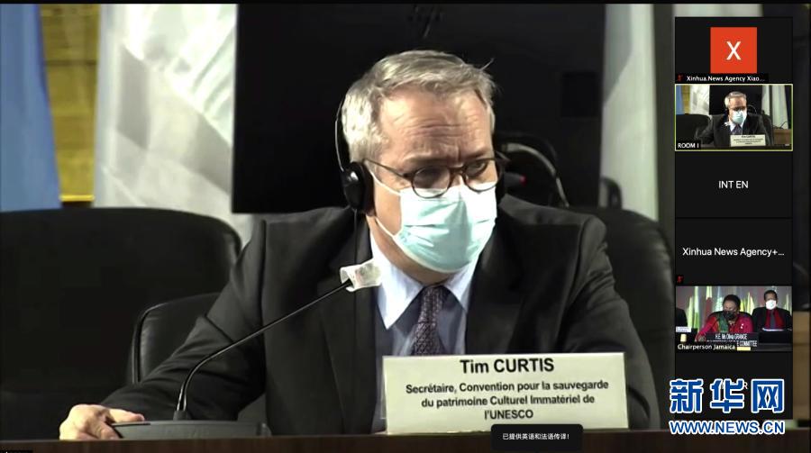 這張12月18日的視頻截圖顯示的是,聯(lián)合國教科文組織《保護非物質文化遺產(chǎn)公約》秘書蒂姆·柯蒂斯在法國巴黎參加線上視頻會議。新華社發(fā)
