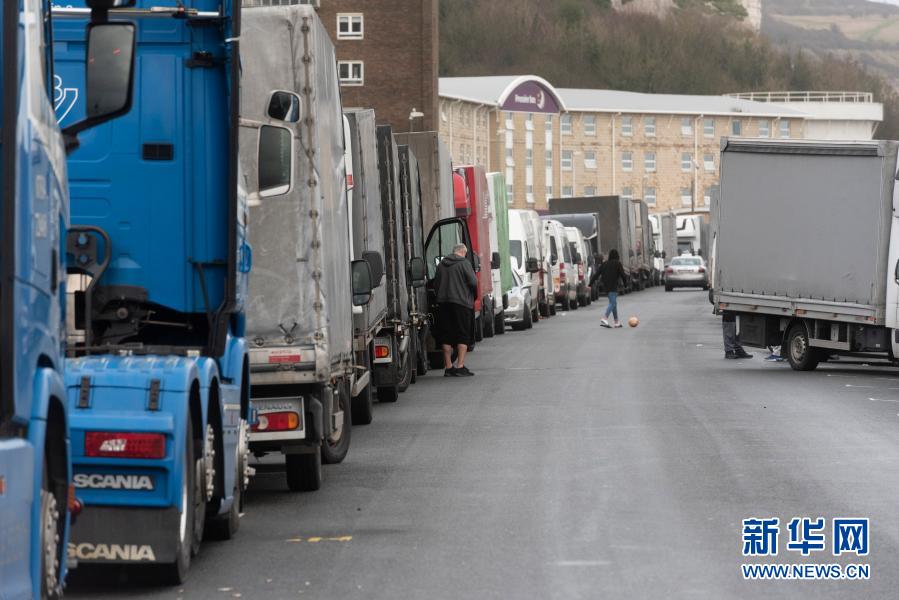 12月22日,在英國(guó)多佛,貨車因多佛港關(guān)閉在外排隊(duì)。新華社發(fā)(雷伊·唐攝)
