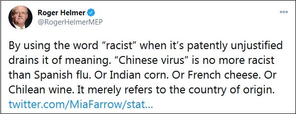 大量網(wǎng)友在他的這條推特下,挖出赫爾默曾經(jīng)發(fā)表的言論。例如早在3月17日,赫爾默就在一條推特中宣稱:“在明顯不合理的情況下,使用‘種族主義’這個(gè)詞會(huì)讓它失去意義。‘中國病毒’和‘西班牙流感’一樣不是種族主義。就像印度玉米,或法國奶酪,或者智利葡萄酒。它僅僅是指原產(chǎn)國。”