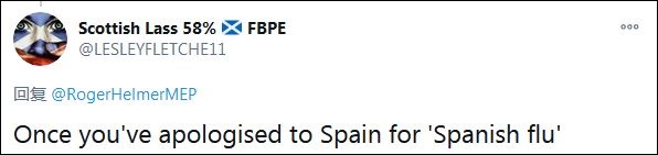 另一名網(wǎng)友接茬說:“只要你為‘西班牙流感’向西班牙道歉?!焙諣柲苍栌谩拔靼嘌懒鞲小?,為“中國流感”的說法狡辯。