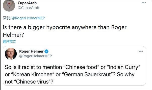 他在12月28日的一條推特中請(qǐng)求外界不要再將變異新冠病毒稱為“起源于英國”,而只是“在英國發(fā)現(xiàn)”。但這條推特徹底“翻車”,大量網(wǎng)民在評(píng)論中挖出赫爾默曾將新冠病毒污蔑為“中國病毒”的評(píng)論,指責(zé)他演繹“非常標(biāo)準(zhǔn)的雙重標(biāo)準(zhǔn)”。