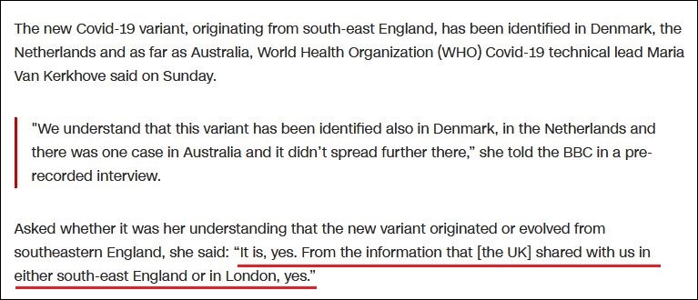 12月20日,CNN援引克爾科夫說,從已知信息來看,變異新冠病毒起源自英國東南部。