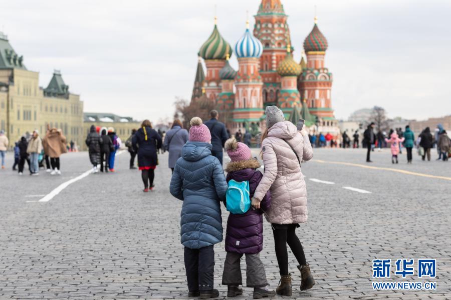 3月23日,在俄羅斯首都莫斯科,人們?cè)诩t場(chǎng)上自拍。