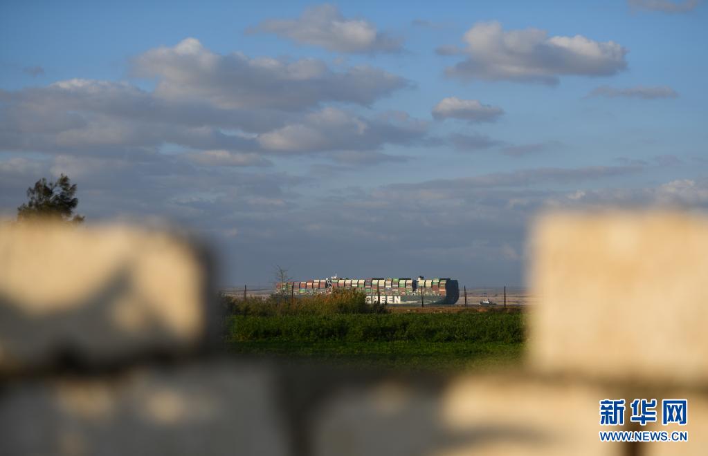 這是3月29日拍攝的移動至埃及蘇伊士運(yùn)河正常航道上的重型貨輪。