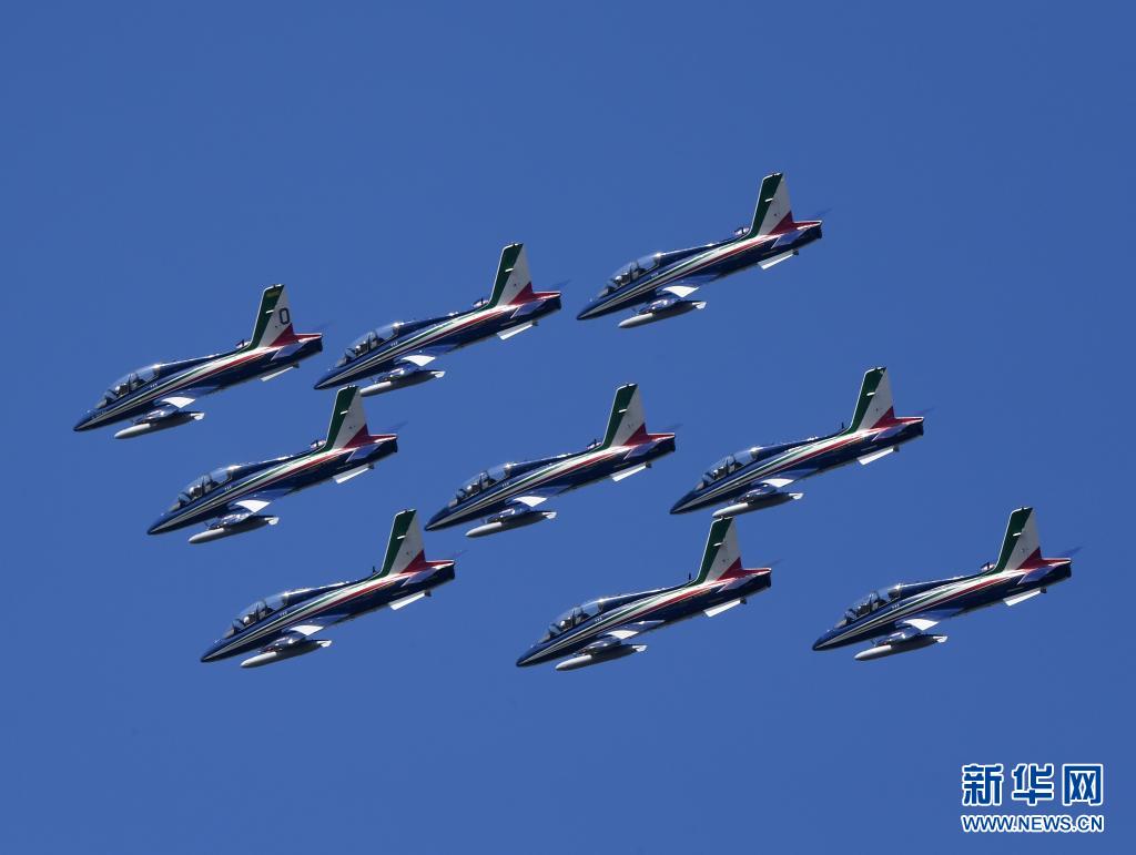 當(dāng)日,意大利“三色箭”飛行表演隊(duì)在意大利首都羅馬舉行飛行表演,慶祝意大利空軍建立98周年。