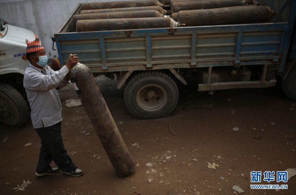5月13日,一名尼泊爾男子在加德滿(mǎn)都搬運(yùn)氧氣罐。