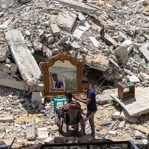 5月26日,在加沙地帶北部的城鎮(zhèn)貝特拉希亞,23歲的巴勒斯坦理發(fā)師阿卜杜拉·扎瓦拉在他被以色列炸毀的房屋前為顧客免費服務?!⌒氯A社發(fā)(里澤克·阿卜杜勒·賈瓦德攝)