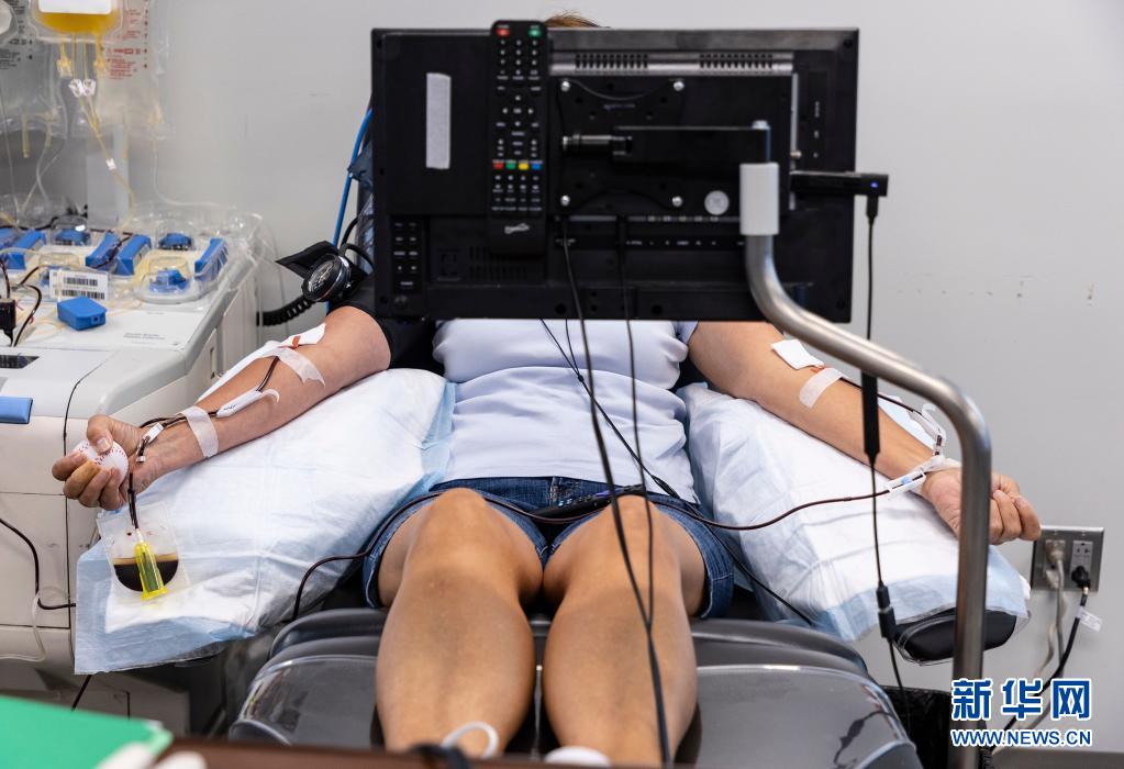 6月14日,在美國(guó)芝加哥,一名獻(xiàn)血志愿者在大芝加哥地區(qū)紅十字會(huì)一獻(xiàn)血站內(nèi)獻(xiàn)血。新華社發(fā)(喬爾·萊納攝)