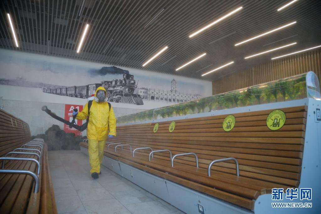 6月24日,工作人員身著防護(hù)服在俄羅斯莫斯科一個(gè)火車(chē)站進(jìn)行消毒作業(yè)。