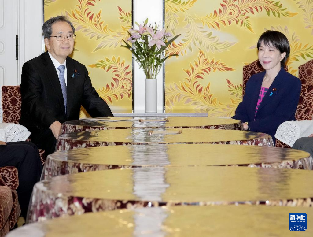 10月10日,在日本东京,日本自民党总裁高市早苗(右)与公明党党首齐藤铁夫准备会谈。新华社/共同社